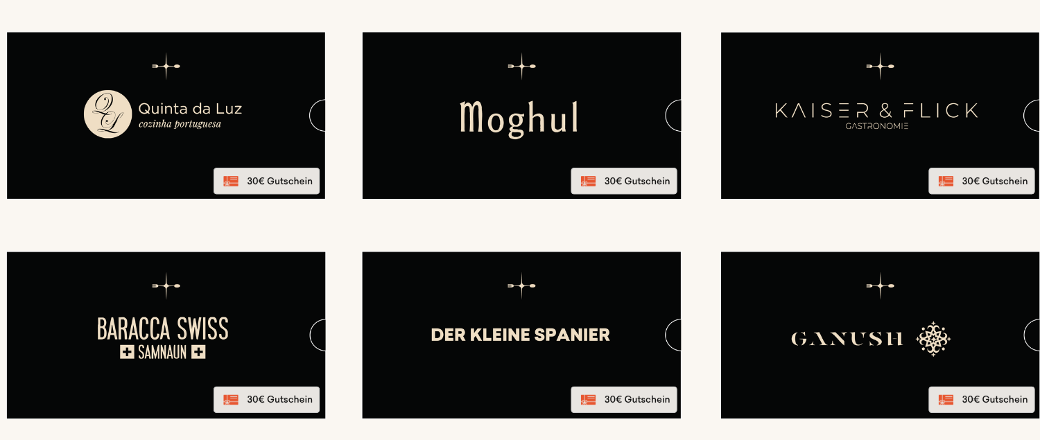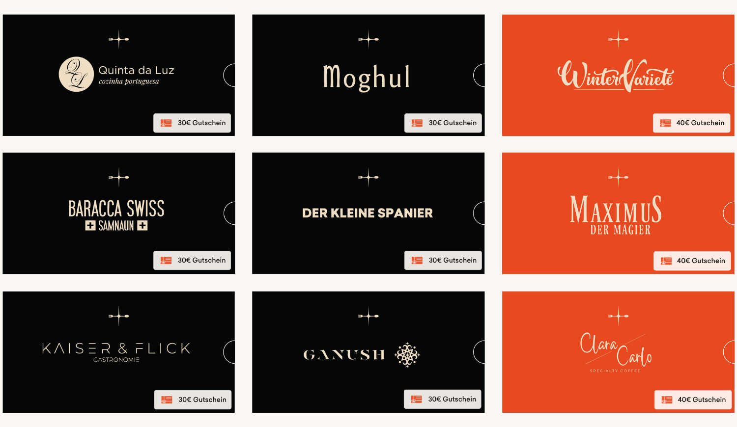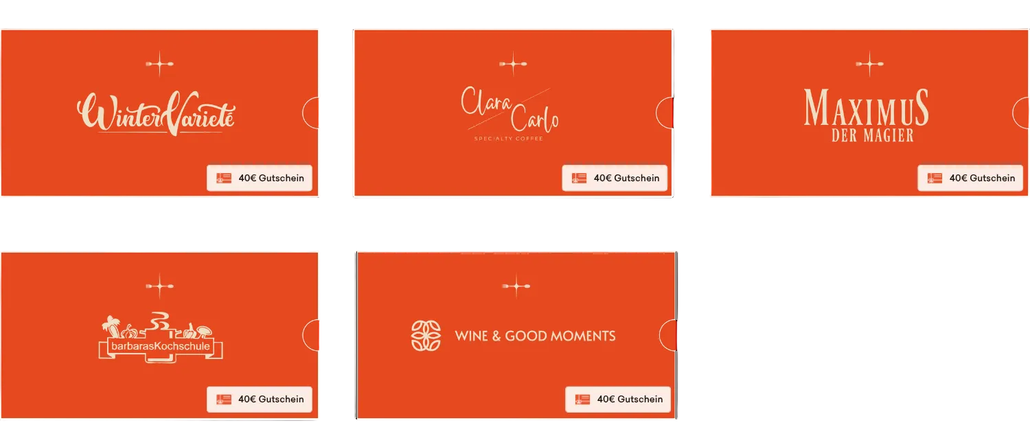 In der Box befinden sich 6 Restaurantgutscheine — für jedes Restaurant erhältst du einen Gutschein im Wert von 30€.